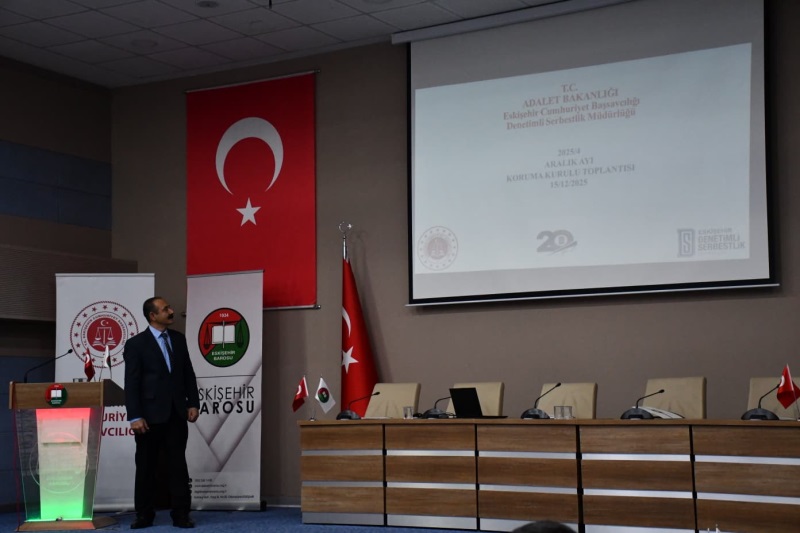 Eskişehir Cumhuriyet Başsavcılığı Koruma Kurulunun Yıl Sonu Toplantısı 15.12.2025 tarihinde Eskişehir Barosu'nda gerçekleştirildi. Eskişehir Denetimli Serbestlik Müdürlüğüne müracaat eden yükümlü ve eski hükümlülerin iş, eğitim, ayni yardım talepleri değerlendirilerek karara bağlandı. Eskişehir Cumhuriyet Başsavcılısı Üzeyir Karakülah'ın Başkanlığını yürüttüğü toplantıya Eskişehir Barosu Başkanı Barış Günaydın, kurul üyesi kamu kurumlarının yöneticileri, sivil toplum kuruluşları yöneticileri ve Denetimli Serbestlik Müdürlüğünün Koruma Kurulu Bürosu çalışanları katıldı.